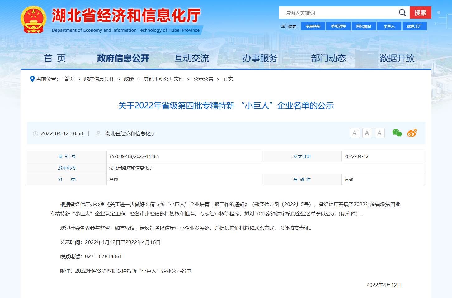 2022年省級(jí)第四批專精特新“小巨人”企業(yè)公示名單