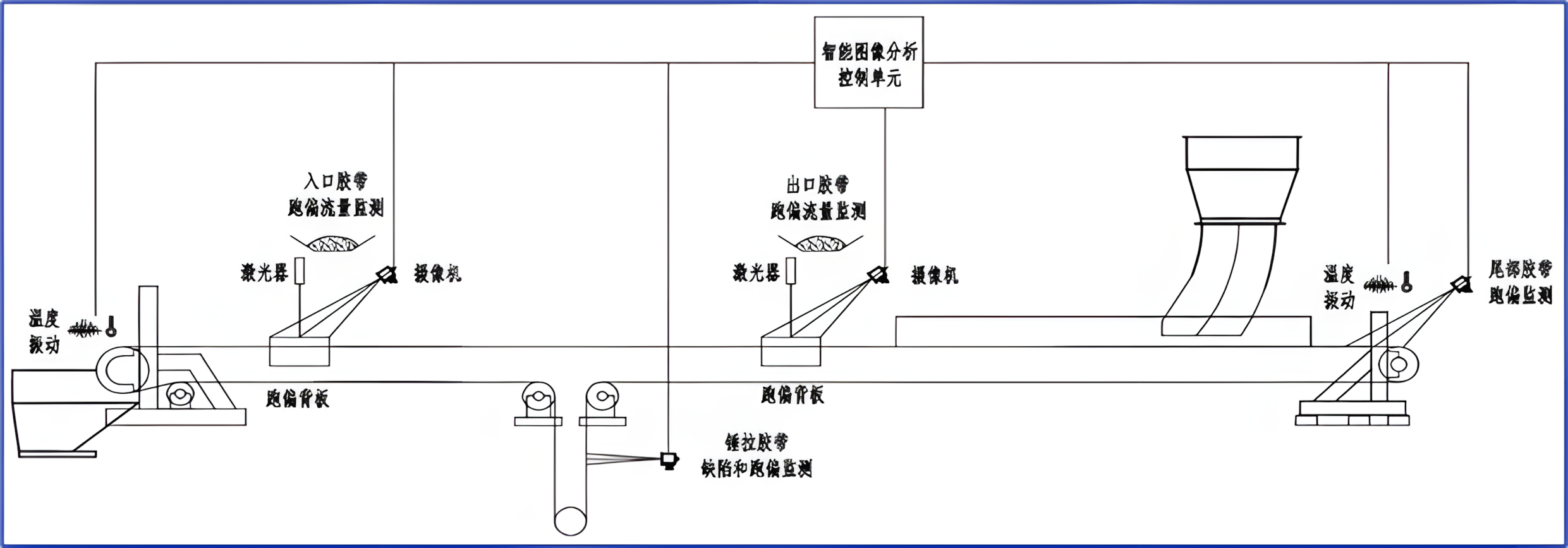 定點(diǎn)攝像機(jī) 在膠帶機(jī)尾部、導(dǎo)料槽出口和頭部安裝定點(diǎn)智能視頻將跑偏信號(hào)數(shù)字化 ,采集料點(diǎn)偏移數(shù)據(jù)、瞬間過(guò)載數(shù)據(jù)等;配置電動(dòng)糾偏裝置 音頻、振動(dòng)、溫度、打滑等傳感器 通過(guò)傳感器采集膠帶速度、電機(jī)溫度、減速機(jī)振動(dòng)、滾筒軸承溫度,托輥故障音頻等數(shù)據(jù)。 |